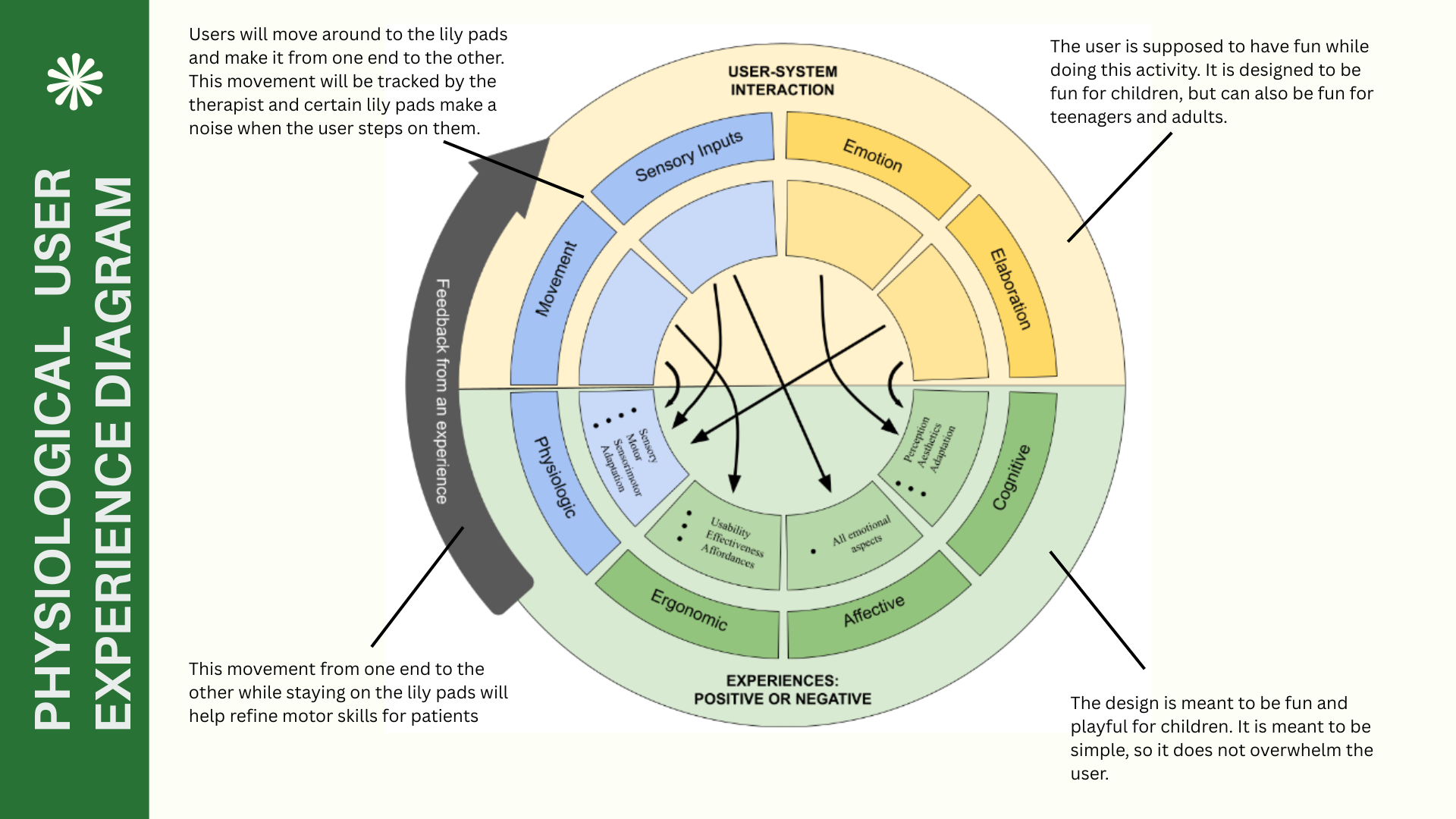 This is my annotated physiological user experience diagram, which maps out the physical and emotional journey of the user throughout the therapy experience. It highlights the key stages of movement, interaction, and feedback within the activity, emphasizing how each part of the design supports user engagement and motivation. By visualizing these steps, I was able to better understand the user’s needs and ensure that the experience encourages positive, enjoyable participation in therapy.