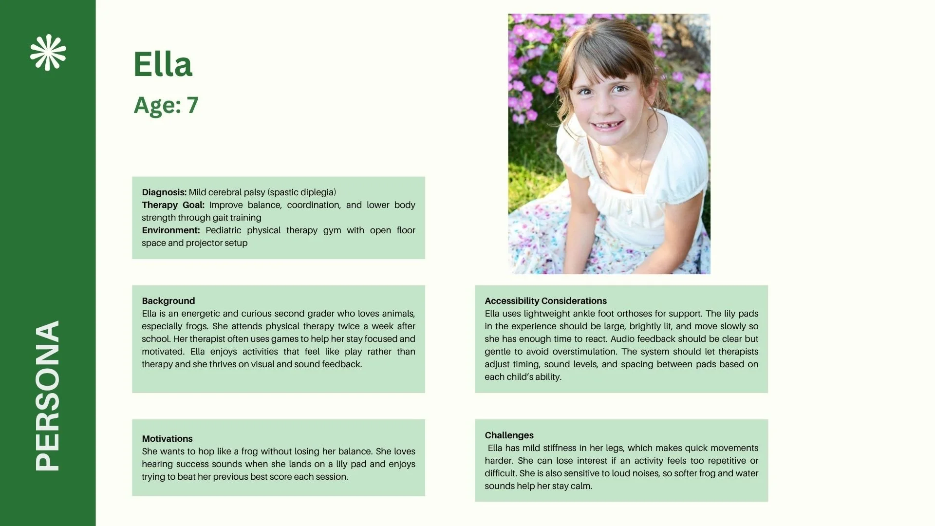 This is my user persona, which represents the target demographic of children who would use this therapy experience. It captures their age range, needs, motivations, and challenges, helping guide the design decisions to ensure the experience is both engaging and accessible for young users.